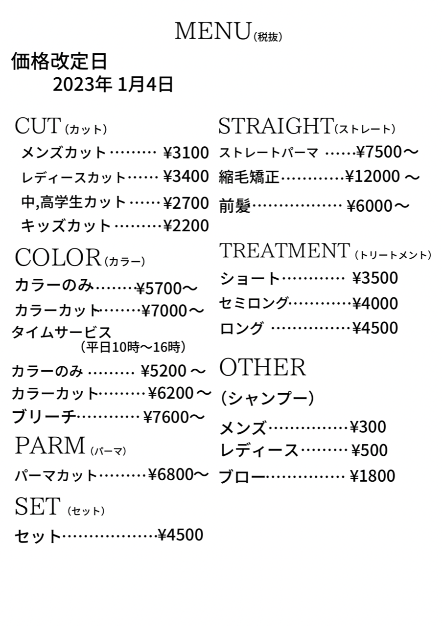Loop’sではお客様に安心してご利用頂けるよう18年間価格の維持に勤めて参りましたが、誠に勝手ながら2023年1月4日(水)より施術に関する原料の値上げに伴って価格の改定をさせて頂きます。